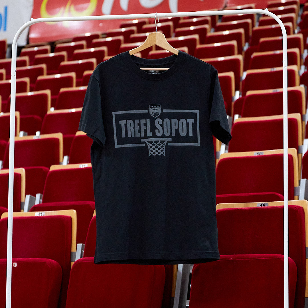 Czarna koszulka z nadrukiem w kształcie kosza z napisem Trefl Sopot!